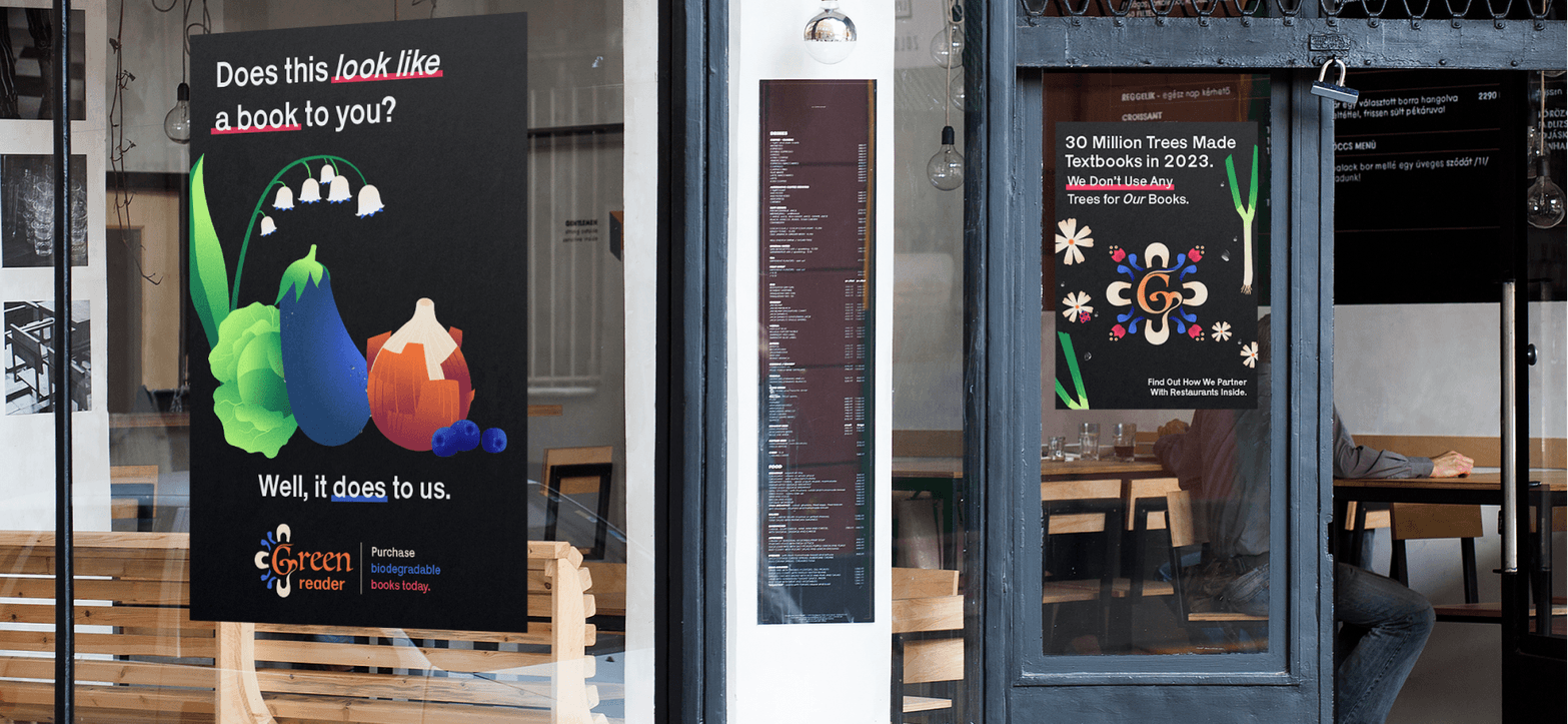 Green Reader focuses on sustainability. Avid readers and paperback book lovers are conscious of how much forests are hurt by their passionate consumption of novels. Green Reader looks to solve this problem while minimizing eye strain by having a fully biodegradable selection of books for readers to enjoy. Green Reader collects fruit, vegetable, and starch waste from restaurants in order to create cellulose paper and all natural pigments that are durable enough to get a few read-throughs, but fine enough to be put into your garden after use and composted back into the earth.